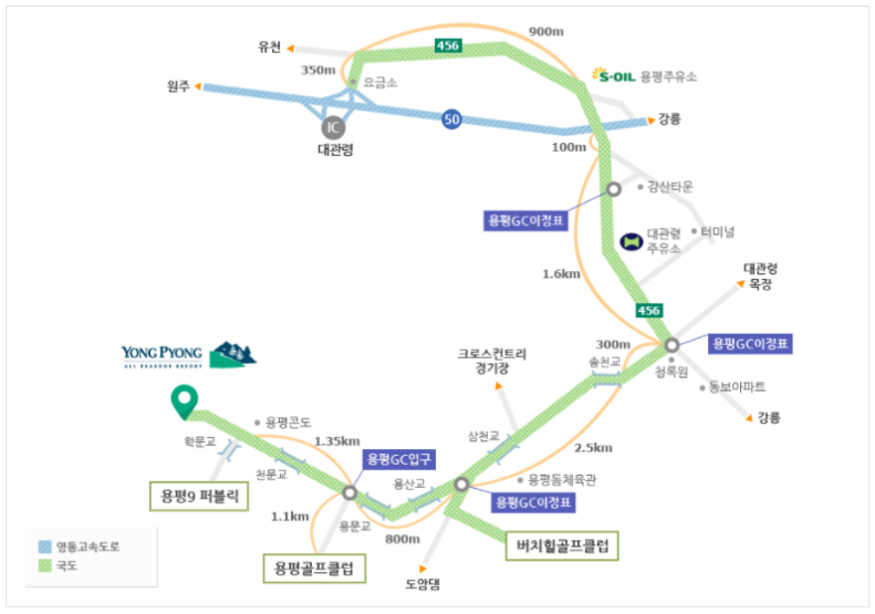 스키장을 30~50% 할인 받아 이용할 수 있으며 용평9 골프장