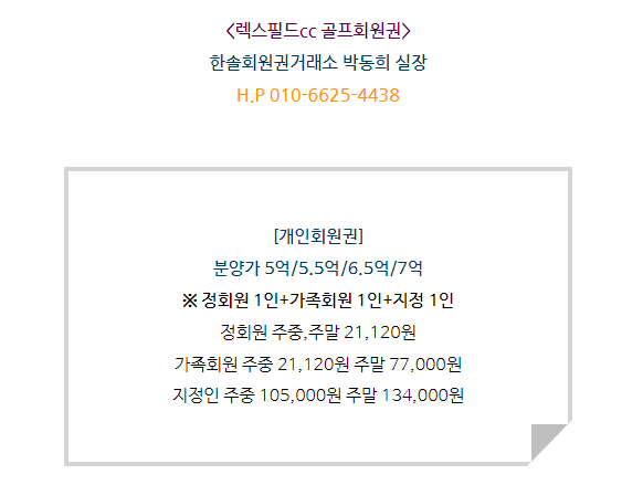 골프회원권렉스필드 렉스필드cc회원권 매매 안내드립니다. 한솔회원권거래소 작성함 2021. 12. 23. 13:37 페이스북에 공유 카카오스토리에 공유 네이버에 공유 트위터에 공유 구글플러스에 공유 + 안녕하세요. 한솔회원권거래소 박동희 실장입니다. 오늘은 렉스필드cc회원권에 대해서 알아보도록 하겠습니다. 매매상담 - 한솔회원권거래소 박동희 실장 010.6625.4438 렉스필드cc회원권은 개인회원권으로 정회원 1인과 가족회원 1인, 지정 1인 입회로 구성되어 있습니다. 분양금액에 따라서 시세가 달라지기 때문에 이 점은 유의하여 주시기 바랍니다. ▼▼▼ 렉스필드cc 이용요금 및 예약안내 렉스필드cc 오시는 길 골프/콘도/휘트니스 회원권 한솔회원권거래소 빠른상담을 원하신다면 아래의 이미지를 클릭하여 주시기 바랍니다. ▼▼▼ 좋아요공감공유하기 URL 복사카카오톡 공유페이스북 공유엑스 공유 게시글 관리 구독하기한솔회원권거래소 저작자표시 (새창열림) '골프회원권/렉스필드' 다른 게시물 보기 더보기 2022.03.25 렉스필드cc회원권 매매 안내드립니다. 2022.01.27 렉스필드cc회원권 매매 안내드립니다. 2021.12.08 렉스필드cc회원권 매매안내 2021.05.06 렉스필드cc 골프회원권 혜택과 정보