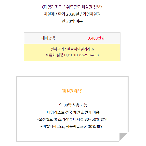 대명리조트 스위트 콘도외눠원 매매 안내드립니다.