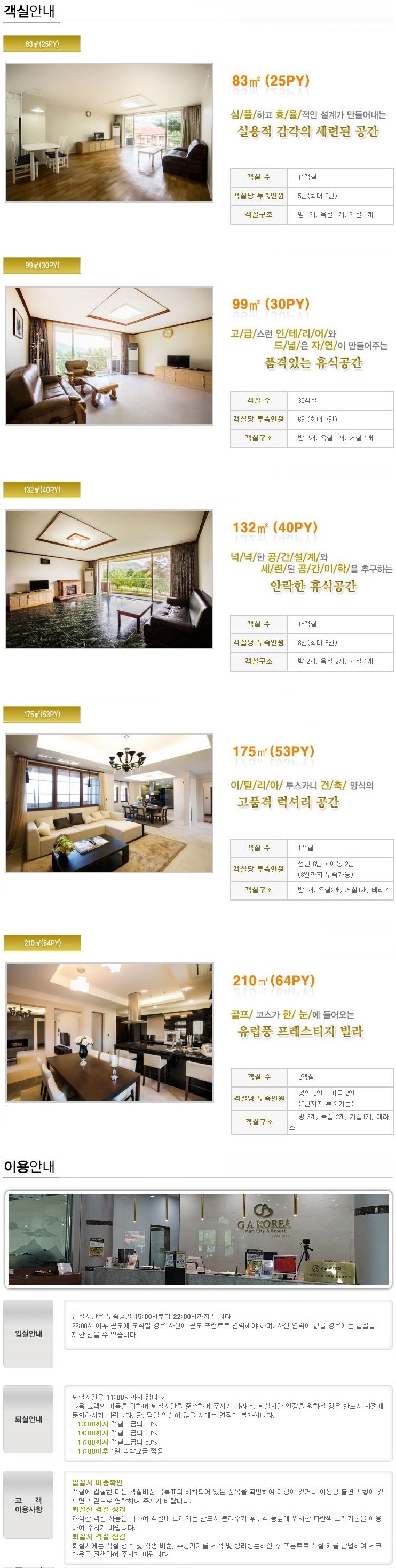 객실안내 : 25평형(11실), 30평형(35실), 40평형(15실), 53평형(1실), 64평형(2실)