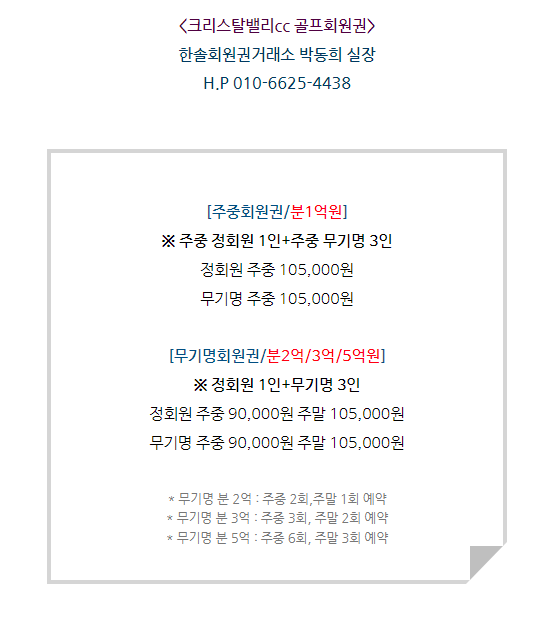 골프회원권크리스탈밸리 크리스탈밸리cc회원권 매매 안내드립니다. 한솔회원권거래소 작성함 2022. 4. 26. 13:09 페이스북에 공유 카카오스토리에 공유 네이버에 공유 트위터에 공유 구글플러스에 공유 + 안녕하세요. 한솔회원권거래소 입니다. 오늘은 크리스탈밸리cc회원권에 대해서 알아보도록 하겠습니다. 매매상담 - 한솔회원권거래소 010.6625.4438 크리스탈밸리cc회원권은 무기명회원권으로 다양한 종류로 구성되어 있습니다. 더욱 궁금하신 부분이 있다면 한솔회원권으로 문의하여 주시기 바랍니다. ▼▼▼ 크리스탈밸리cc 이용요금 및 예약 안내 크리스탈밸리cc 위치 골프/콘도/휘트니스 회원권 한솔회원권거래소 빠른상담을 원하신다면 아래의 이미지를 클릭하여 주시기 바랍니다. ▼▼▼ 좋아요공감공유하기 URL 복사카카오톡 공유페이스북 공유엑스 공유 게시글 관리 구독하기한솔회원권거래소 저작자표시 (새창열림) '골프회원권/크리스탈밸리' 다른 게시물 보기 더보기 2022.07.20 크리스탈밸리cc회원권 매매 안내드립니다. 2022.02.18 크리스탈밸리cc회원권 매매 안내드립니다. 2021.12.31 크리스탈밸리cc주중무기명회원권 매매 안내드립니다. 2021.08.10 크리스탈밸리cc 골프회원권 안내드립니다.